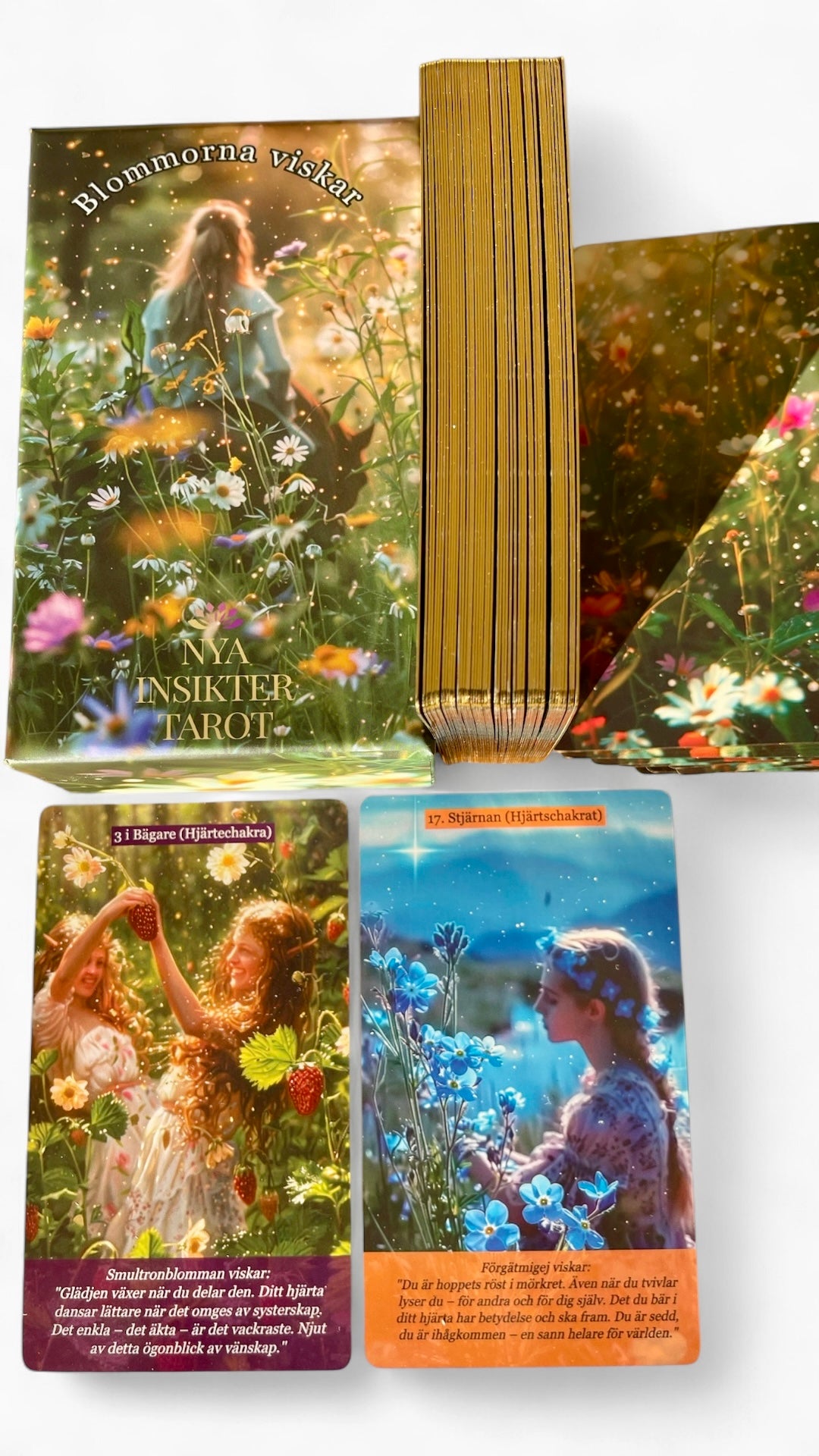 Blommorna viskar är en vackert illustrerad kortlek med 78 kort som förenar den klassiska tarotens struktur med blommornas symboliska språk. Korten kan användas både som en fullvärdig tarotlek – med både Stora och Lilla Arkanan – eller som ett intuitivt orakel för daglig vägledning och andlig kontakt.
